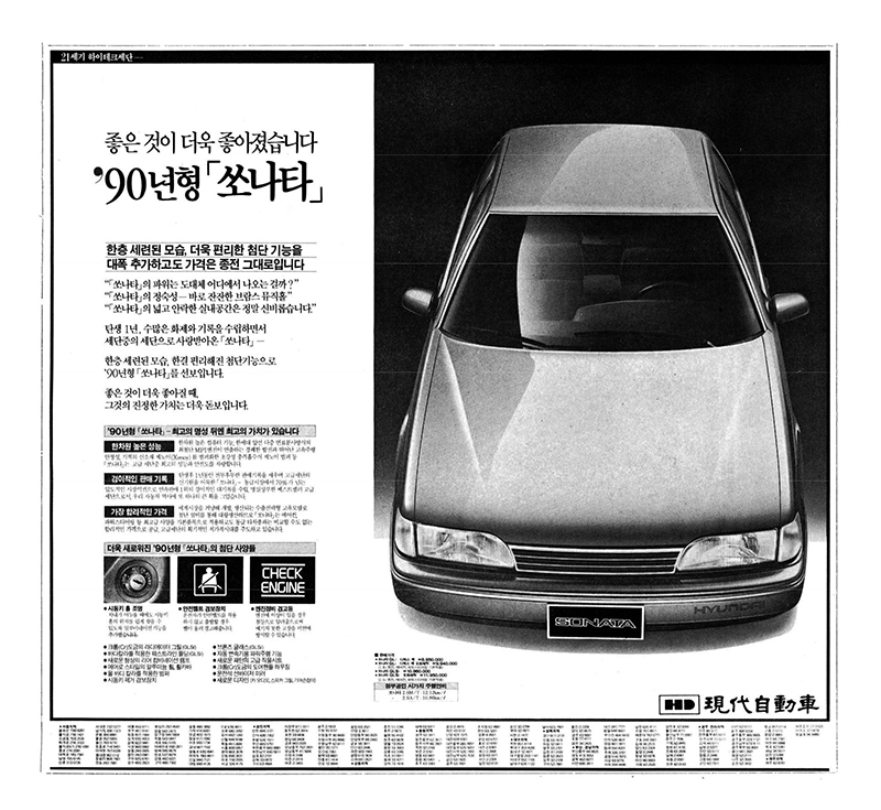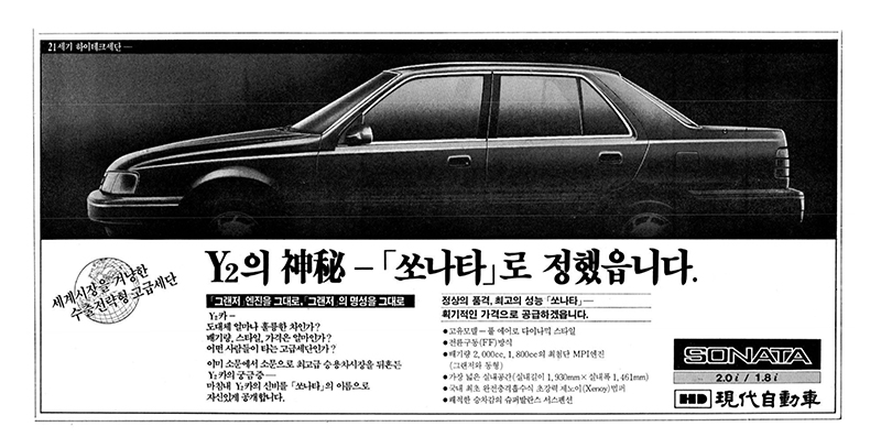스텔라는 85년 캐나다 수출을 시작하면서 좀 더 두툼해진 우레탄 범퍼를 장착한 내수버전을 CXL이라는 트림으로 판매하며 인기를 끌었습니다. 87년에는 서스펜션을 위시본/4링크 방식에서 맥퍼슨스트럿/5링크로 바꾸면서 상품성을 개선했죠. 스텔라는 모델을 세분화하고 옵션패키지도 다양화하여 선택의 폭이 상당히 넓었습니다. 사실 당시 차종 선택의 폭이 작았던 시절이어서 이런 얘기까지도 있었어요. 차를 고를때는 새차냐 중고냐, 소형이냐 중형이냐, 현대냐 대우냐 이것만 고르면 나머지는 옵션과 컬러 선택이라고 할 정도였죠. 스텔라는 그런 현상에 변화를 주면서 차종세분화에도 많은 영향을 끼친 모델이라고 보실 수 있습니다. 올림픽을 앞두고 택시의 고급화도 진행되면서 그 전에는 소형차 중심이던 택시도 중형화되면서 스텔라 택시도 인기를 끌게 되었죠. 저도 당시 스텔라를 타보고 싶어서 일부러 택시를 탄 적도 있었던 기억이 납니다. 나중에 저희 아버지도 연금색 스텔라 88을 구입하셨어요. 저희 집으로써는 프레스토 아멕스에 이은 두번째 차이기도 했었죠. 그런데 이 차와 찍은 사진은 없더라구요. 사실 저희 아버지는 그리 활동적인 분이 아니셔서 주말에는 주로 집에서 휴식을 취하셨고 저는 주말이면 나가 돌아다니는 편이었고 또 차를 쓰게 된다면 어머니차였던 프레스토를 타고 다녔었으니까 그랬던 것 같습니다. 그때는 지금처럼 카메라가 내장된 휴대폰이라는 것은 공상과학소설이나 영화속에나 등장하는 상상의 산물이었고 특별한 경우가 아니면 카메라를 들고 나가지도 않았으니 일상사진이 그리 많지 않기도 했었죠. 아버지가 스텔라 다음으로 구입하셨던 차는 Y2 쏘나타였습니다. 미쓰비시와 공동개발한 그랜저의 플랫폼을 바탕으로 개발한 Y-2 쏘나타는 처음부터 미국 수출을 염두에 두었어요. 당시 넘사벽으로 여겨졌던 도요타 캠리, 혼다 어코드와 경쟁할 수 있는 수출전략형 중형차로 개발되었죠. 영하 40도의 캐나다 혹한 테스트부터 영상 42도의 미국 고온 테스트, 해발 1만 피트 고지 테스트 등 세계 각지의 다양한 지형에서 혹독한 시험을 거치며 개발된 쏘나타는 1988년 6월에 데뷔했습니다.