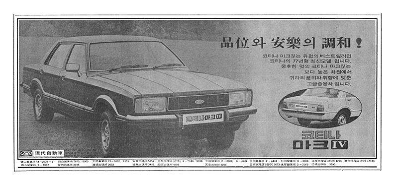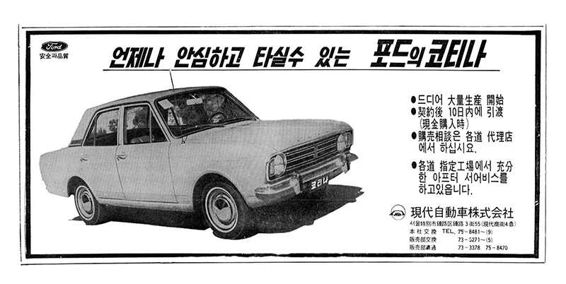 행사에서 다루었던 사진과 이야기를 여기에서도 조금 풀어놓을까 해요. 행사에서 미처 하지 못했던 이야기도 조금 있구요. 현대자동차는 첫 시작을 중형승용차로 끊은 메이커입니다. 당시 신진은 도요타 코로나를 주력으로 고급차인 크라운과 경차인 퍼블리카, 랜드크루저 픽업 등을 조립생산하고 있었고 기아산업은 아직 삼륜차를 생산하고 있었습니다. 당시 사진이나 영상을 보면 도로를 달리는 차의 대부분이 신진 코로나이거나 관용 지프였죠. 코티나는 영국 포드의 모델이었는데 상당히 인기있는 모델이었고 현대자동차가 도입한 차는 2세대 모델인 코티나 Mk2 였습니다.
