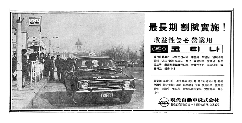 현대 코티나는 1.6리터 엔진을 탑재한 중형차로 1.5리터급인 코로나보다 차체도 크고 힘이 좋아서 초기 반응은 좋았습니다. 컬럼시프트의 벤치시트 구성으로 앞좌석에도 3명이 탈 수 있어서 6인승으로 쓰였죠. 영업용으로는 5인승으로 승인이 났었다고 합니다. 코티나는 당시 도로포장률이 높지 않았던 대한민국의 도로에서 영업용으로 험하게 굴리는 경우가 많다보니 고장이 많았다고 합니다. 당시는 자동차가 워낙 고가이다보니 자가용을 구입할 수 있는 계층은 대단히 한정적이었고 관용과 영업용의 비중이 높을 수밖에 없었는데 코티나는 자가용 시장에서는 선방을 했어도 영업용 시장에서는 소기의 성과를 거두지 못했죠. 그 후속 모델로 들여온 차는 뉴 코티나였습니다.