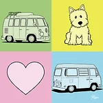 폭스바겐 타입2는 마이크로버스라는 이름으로도 잘 알려져있습니다.실용성이 높으면서도 튼튼하고 경제적이어서 많은 사람들이 애용했고 캠핑카로도 많이 만들어졌습니다. 특히 웨스트팔리아(Westfalia-Werke)는 1951년부터 폭스바겐의 공식 캠퍼 개조업체로 활약해왔습니다. 그림은 폭스바겐 타입2 T1과 베이윈도우라고도 불리는 타입2 T2의 웨스트팔리아 캠퍼입니다. 웨스트팔리아는 흔히 웨스티라는 애칭으로도 불립니다. 그런데 구글에서 Westy를 검색하면 사실 웨스트팔리아 캠퍼보다는 웨스트 하일랜드 화이트 테리어가 먼저 나오죠. 그래서 저들을 하나의 그림에 넣어서 앤디 워홀 스타일로 한번 만들어봤습니다. 하나 남는칸에는 제 딸이 하트를 넣어보라고 해서 그렇게 마무리지었구요. ^^